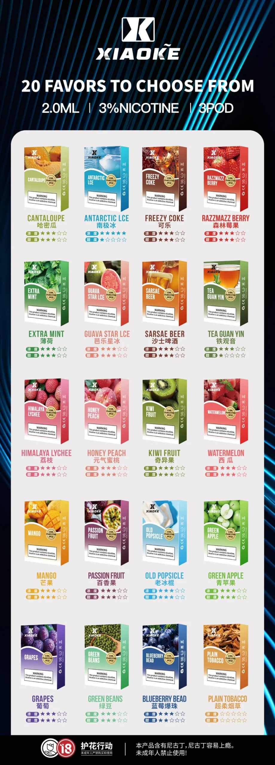 | 口味 | 葡萄冰, 百香果, 鐵觀音, 荔枝, 老冰棍, 哈密瓜, 南极冰, 可樂, 莓果, 薄荷, 芭樂星冰, 沙士, 蜜桃, 奇異果, 西瓜, 芒果, 青蘋果, 綠豆, 藍莓, 超柔菸草 |